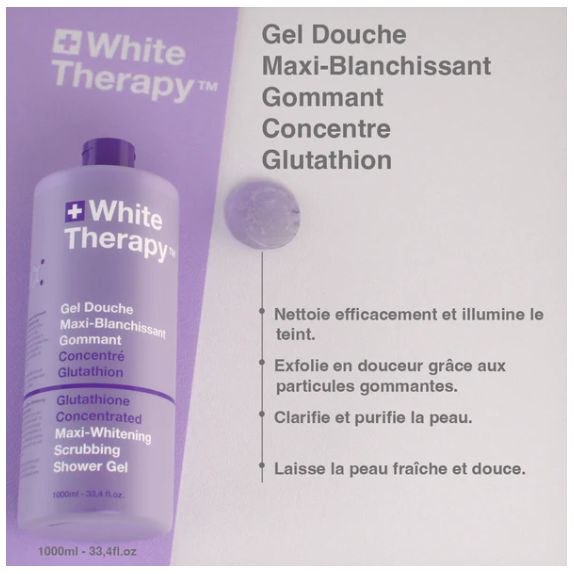 Gel Douche Maxi-Blanchissant Gommant Concentré Glutathion – Nettoie, exfolie et illumine :